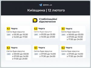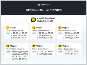 12 лютого Київська область працюватиме у режимі можливих контрольованих обмежень електропостачання. Загальнодержавну координацію балансу здійснює НЕК “Укренерго”, а реалізацію графіків у регіоні забезпечує ДТЕК Київські регіональні електромережі.